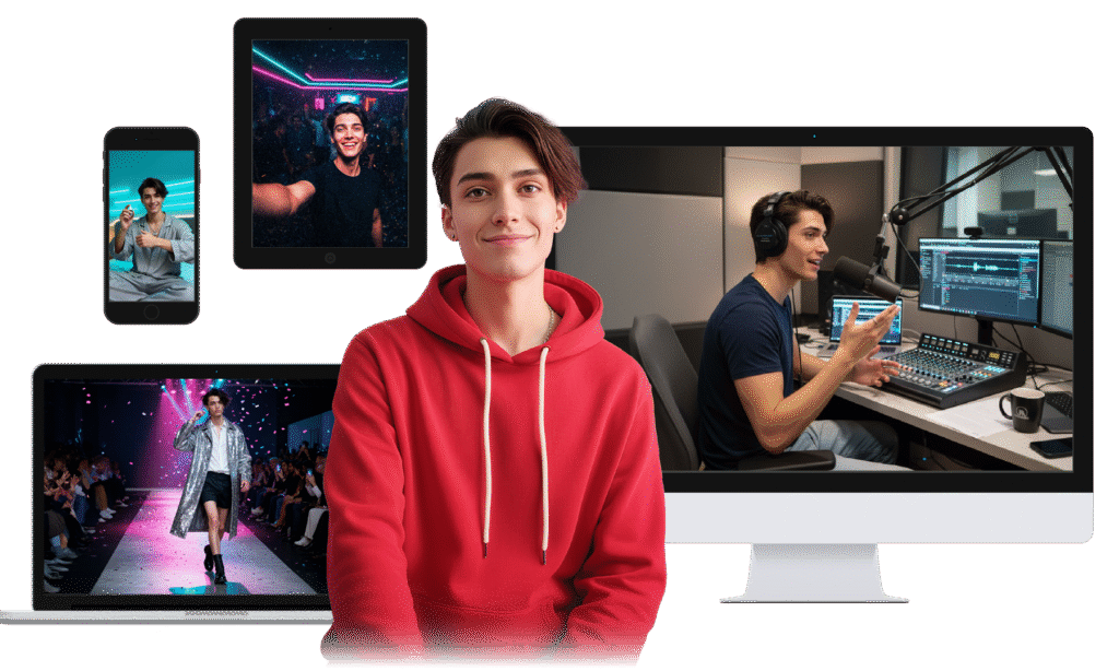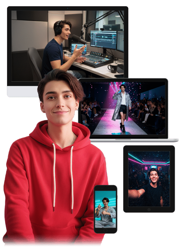 Produce creativos de campaña, anuncios en video, thumbnails y portadas con el mismo personaje; coherencia visual en todas las apariciones y alta resolución para cualquier plataforma.